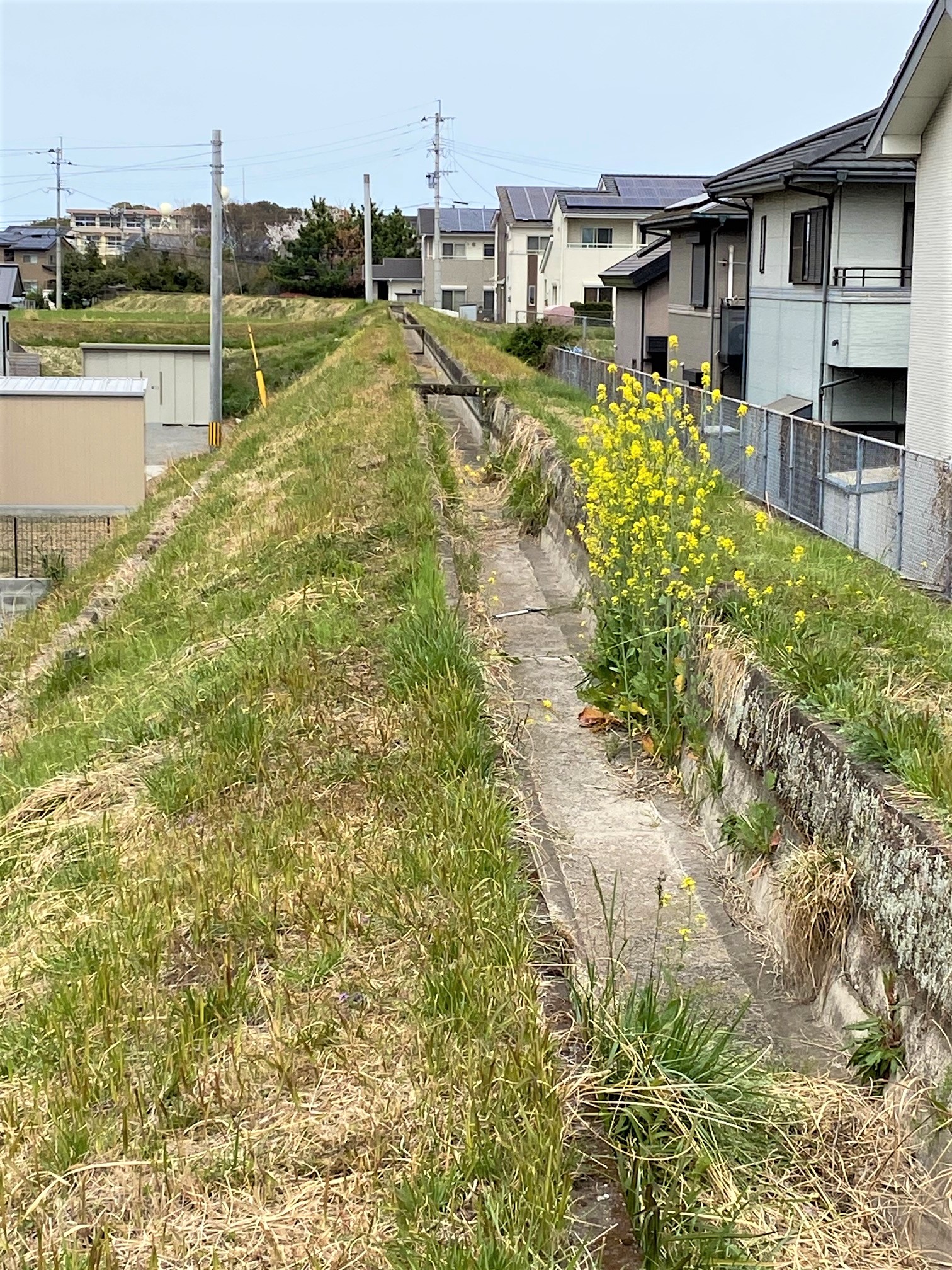 夢見草の裏手に廻りこむと、東側職員駐車場の奥に南北に「昭和井路」が