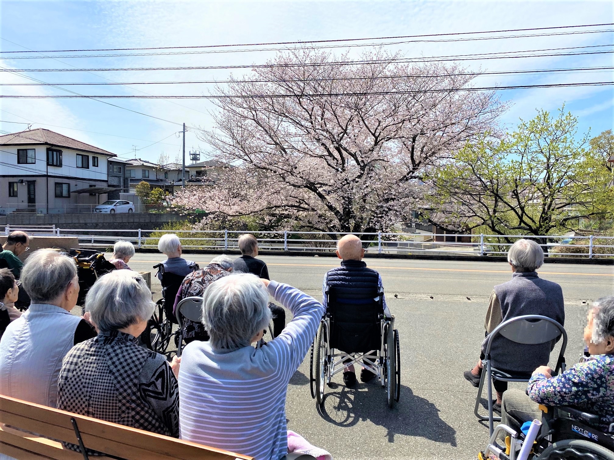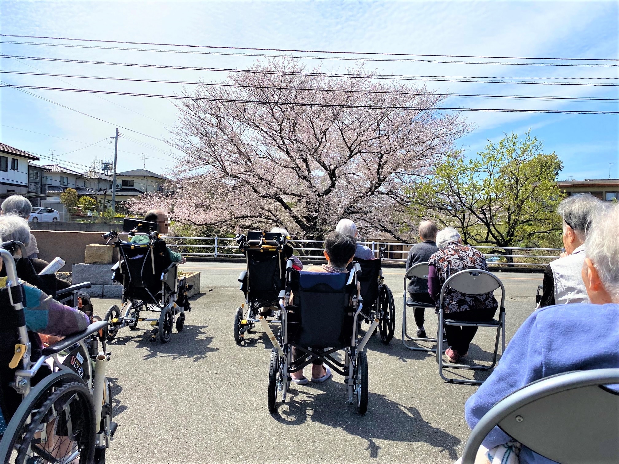 4月2日は、いくらか肌寒さはあったものの陽射しが心地よく、利用者様全員でお花見です。